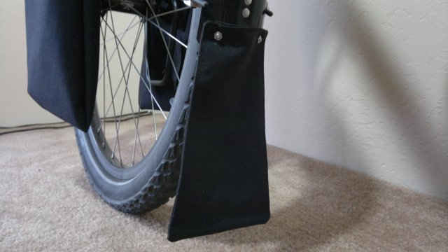 The mudflap is sewn as a 2-layer "envelope" then hung from the front fender. The fabirc is very light, so to keep the mudflap from blowing back, he uses a small weight.
