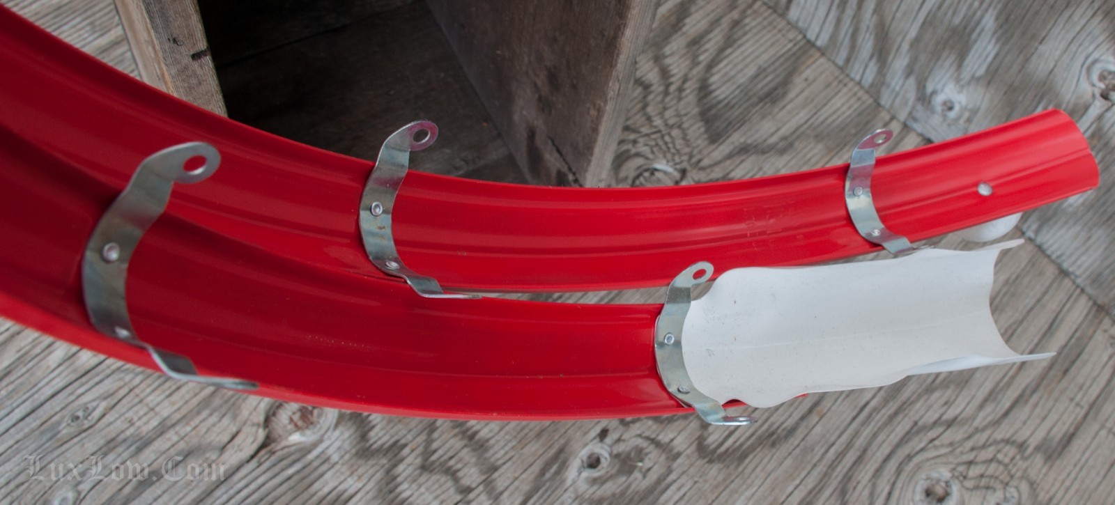 I smoothed/rounded the edge of the strap, but the aluminum is thin and so the edge is still relatively sharp. Better would be to bend the lower edge to have a slight curve away from the fender — looking at it sideways, instead of looking like a straight line "|", it would resemble a "J". Then, when the mudflap bends back, it could wrap around the curve, rather than folding on the edge.