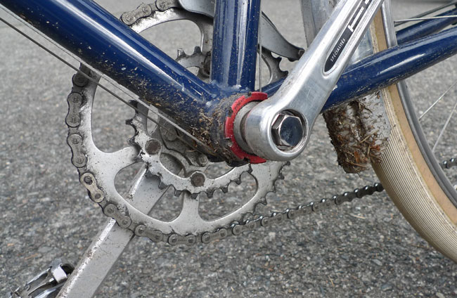 Jan Heine accidentally pulled out his front mudflap, then rode in the wet without replacing it. With the mudflap, the bike stays clean. Without it, the bike got dirty (shown) — and him, too (not shown). Details at [https://www.renehersecycles.com/no-mudflap-what-a-mess as of 2025-10-15].