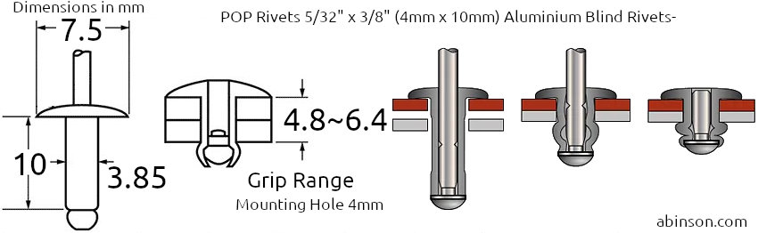 By way of explanation, here are some pictures of blind rivets. There are dimensions given in the pictures, but I used a different size: 2.4 mm (nominal 3/32”) diameter.