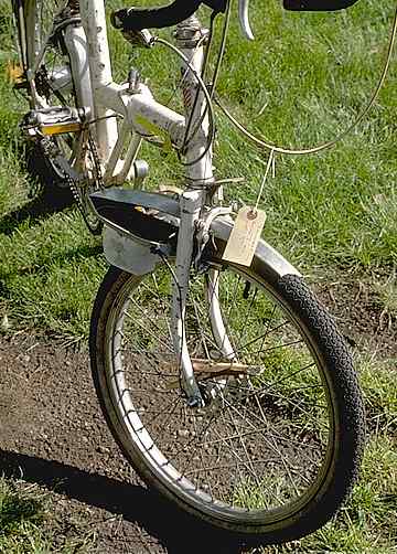 A fallen tree branch jammed in the spokes, crumpled this fender and launched John Allen over the handlebars. He is glad that he was wearing a helmet. |