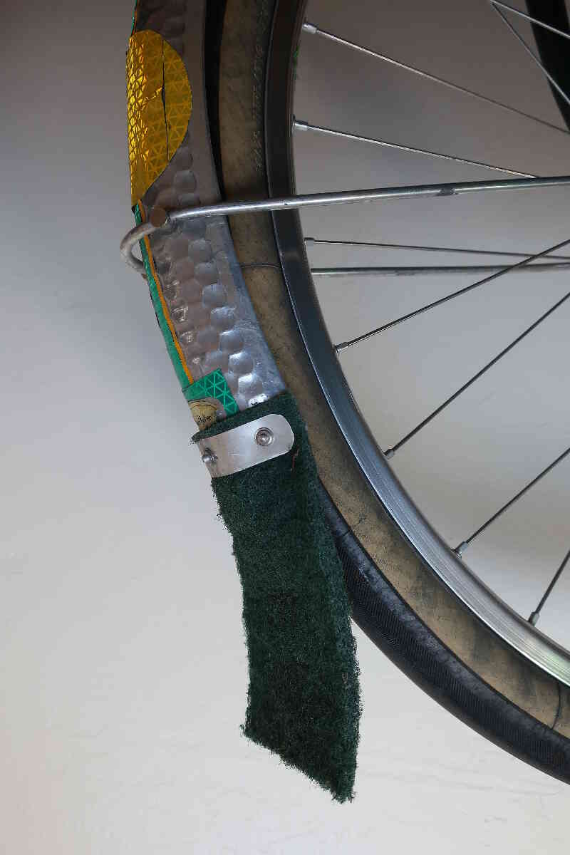 The mudflap is sewn as a 2-layer "envelope" then hung from the front fender. The fabirc is very light, so to keep the mudflap from blowing back, he uses a small weight.