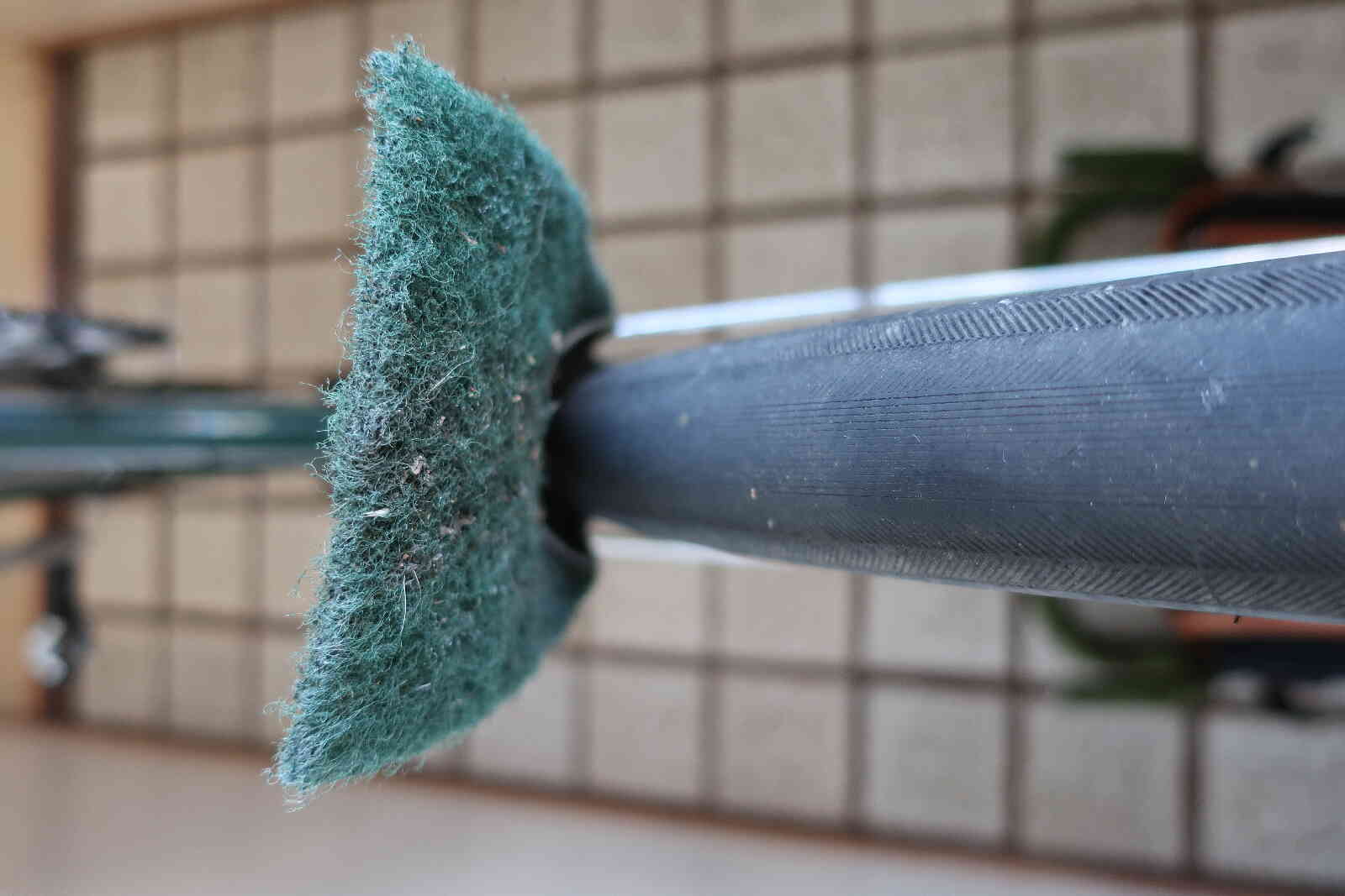 The scouring pad I use does not seem to collect dirt or grit — I suspect most of it gets shaken out fairly quickly. I have been using mine for several thousand kilometres, and the light passing through looks similar to a new pad, which suggests not much trapped dirt. However, I have not weighed it.