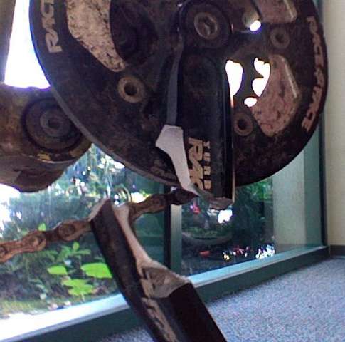 Note failure is in center of arm away from most features, but at the edge of a "window" in to the hollow crank, and in an area of relatively thin section compared to the "window" closer to the spider.