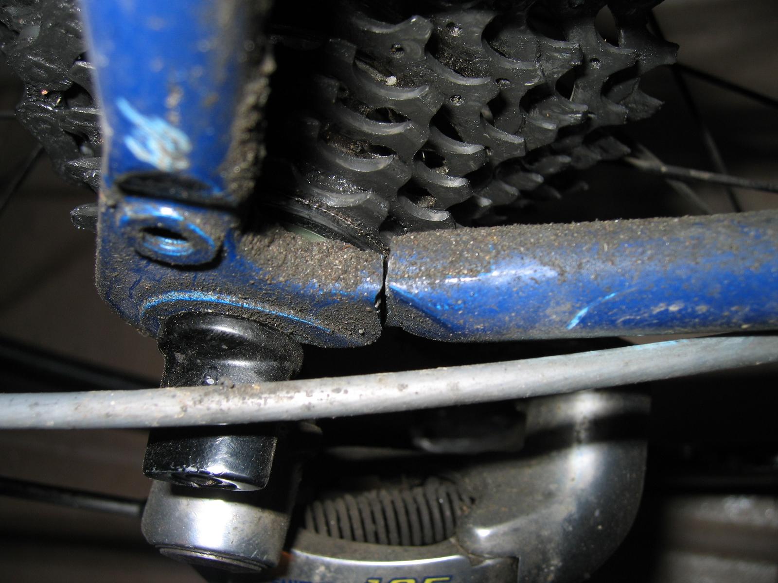 Steel. Failed at chainstay/dropout junction, while accellerating hard from a stop. Discovered by sound of tire rubbing, wobbly handling. Steel frame. Rear hub originally Bontrager as from manufacturer; after rim damage at about 6,000km, replaced with Rolf Vector.