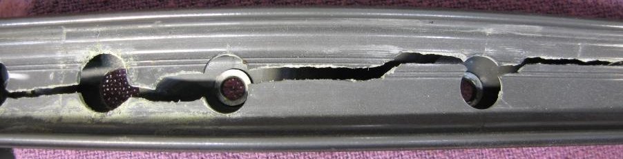 Cracking is widest near valve hole. Rim was ridden about 200-300km after first noticed brake rubbing (due to spreading of sidewalls from loss of support of the tube bed).
