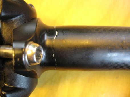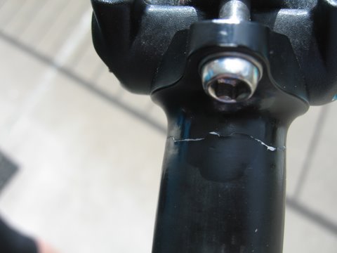 Note the seatpost narrows at the clamp, thus raising stresses. Also, seat clamp bolt tension tends to bend the post head, which may also stress the post near the fracture.