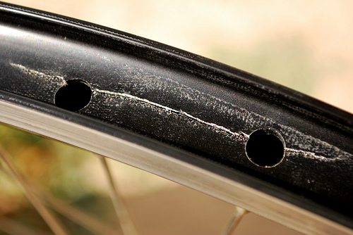 Rim use approx. 3,500 km. Rider plus bike plus gear weight about 110 kgf. Used in hilly riding.